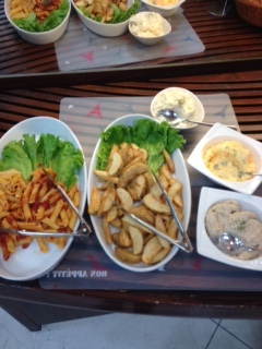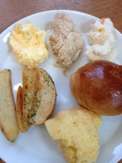 食パン、ソフトフランスパン、白パンもあり、ディップにツナサラダ、ポテトサラダ、卵サラダも置かれていました。