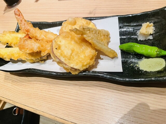 旬の天麩羅盛り合わせでは白身魚の開きやナス、さつまいも、エビを頂きました。天麩羅の王道であるエビはみがぷりぷりで食べ応え抜群。白身魚の開きも天麩羅で頂くとこんなに美味しいのかと驚嘆しました。