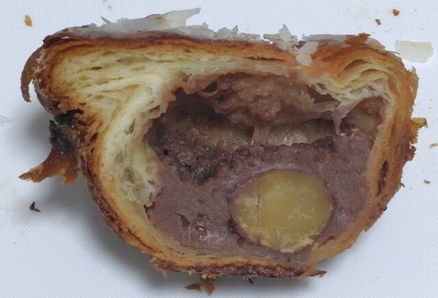 観察してみると、クイニーアマンにしてはちょっと変わった形状ですね。断面をみると、底面には栗が入っていて、その周りには栗のペースト?クリーム?が入っていました。