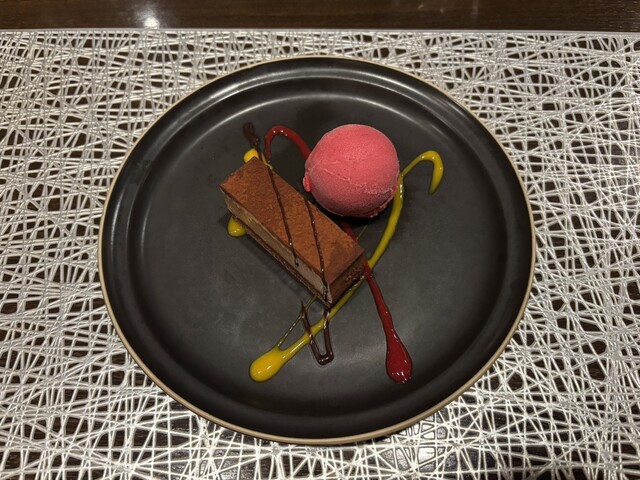 フルーティーで爽やかなカシスのアイスと、甘すぎないショコラは互いを引き立て合う組み合わせで、コースの締めくくりにぴったりでした。