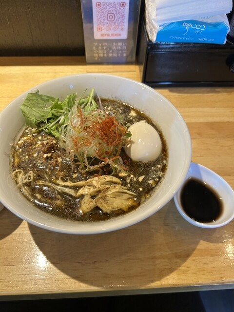 着丼すると、黒胡麻と辣油が浮かぶスープに、水菜や玉ねぎ、味玉が綺麗に盛り付けられ、見た目から食欲をそそります。
