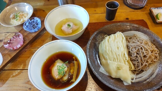 つけ麺スープダブルと雲呑と日本酒3種飲み比べ