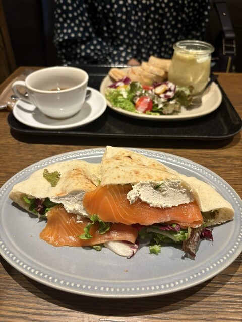 ランチメニューから、家族はエッグスラットとロングブラック、私はサーモンとスパイスホイップチーズのパニーニをいただきました。この日私は、体調を考えてコーヒーは控えました。