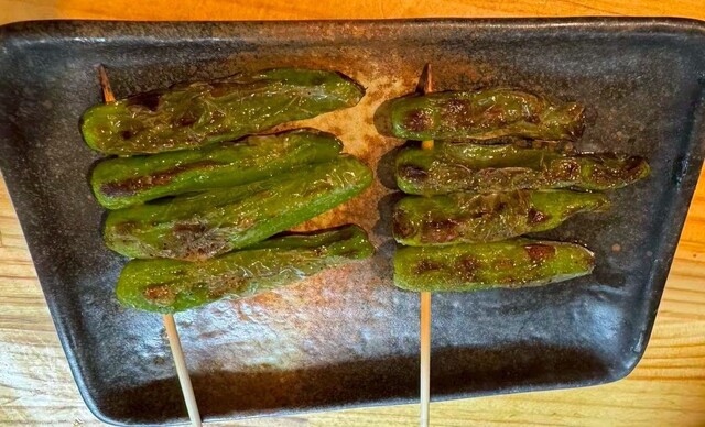 ししとうの串焼きは香ばしく、程よい苦味がいいアクセント。口の中がリセットされて次の一品へ進みやすい。