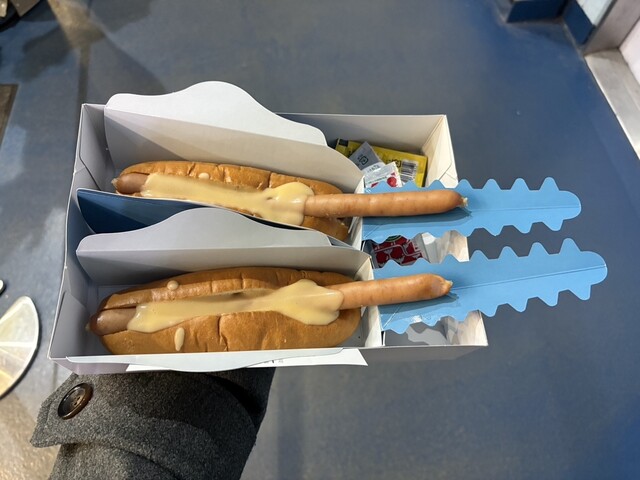 ノコギリエイのようなホットドッグ。チーズトッピングをして、さらに美味しくいただきました。