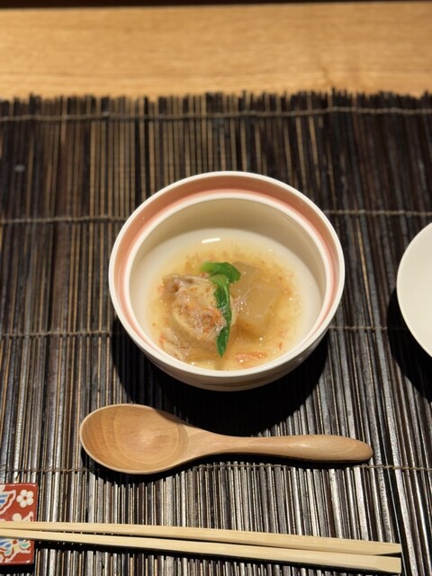 魚料理は香ばしく焼き上げた金目鯛の西京焼き。合肴には季節の野菜と蟹を使った優しい味わいの椀物が登場し(信田巻きと大根の煮物)どの料理にも繊細な技が光ります。