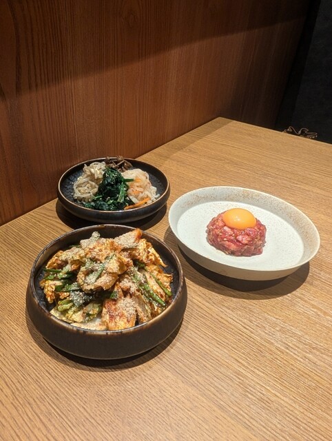 前菜はユッケ、ナムル、キムチキャベツの盛り合わせからスタート。ユッケは新鮮な肉の甘みとコク深いタレが滑らかに絡み、口の中で溶けるような上品な食感が絶品でした。ナムルは野菜のシャキシャキした歯ごたえとピリッとした風味が爽やかで、キムチキャベツの酸味が全体を引き締めます。