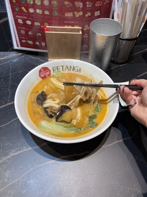 茶屋町と中崎町の間、ジャンカラが目印‼️できていたのは知っていたのだが、全然行けなかったところなんですよね(^_^)今日は寒くてお腹が空いていたので、麻辣湯がどうしても食べたい‼️と探していたところここを思い出し、来店。お店は3組ほど待ちがありましたが、正直並んでた方がいいかも?と思うくらいオーダーチェック式なので待った感覚はありませんでしたね(^_^)☆私はあまり辛いのが得意じゃないので1からにしました、その後具材をチェックしていくのですが、とても嬉しいと思ったのが、いくらかわかったところです‼️だってグラムで測るところってさぁ⁉️いくらになったか分からずビクビク震えてるんですよぉヽ(;▽;)ノこれはありがたいですわ(^^)まぁお金がない私が悪いんですけどねえ⁉️しかし、肉団子や餃子が好きな私には難易度高めですので、助かりましたはい、ということで少し待ったら席に案内され、カウンター席でした。3組ほどテーブル席があり、そこから意外と待って5分くらいで出てきました。スープは味噌っぽさととんこつ感があるようなラーメンに近い味わいの麻辣湯でした。値段もまぁちょうどいいくらい⁉️調味料は別テーブルに設置されたアラカルト的な席に撮りに行くSTYLE‼️これはこれで美味しかったですが、スタンダード麻辣湯を求めている方は、有名で広まったお店から食べていくことをおすすめしますね美味しかったです〜♪