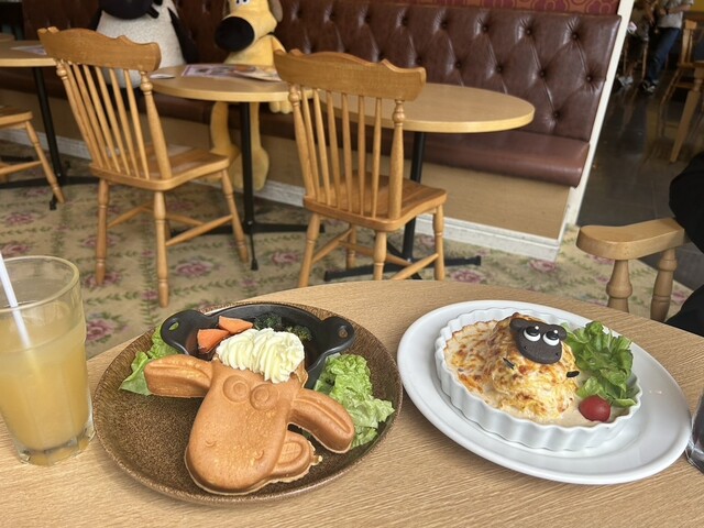 • 感想:ショーンの顔が描かれたワッフルがインパクト大!ワッフルはほんのり甘く、横に添えられた煮込みハンバーグと合わせると、甘じょっぱい組み合わせが絶妙です。ハンバーグはしっかり煮込まれていてジューシー。見た目の可愛さだけでなく、お料理としての満足度も高かったです。付け合わせの野菜やサラダも彩りが良く、バランスの取れた一皿でした!