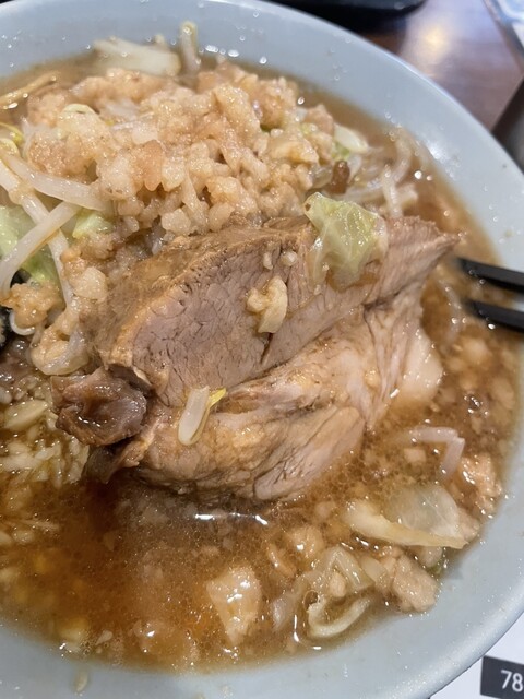 着丼した瞬間からそのビジュアルに圧倒されます!山盛りのもやしとキャベツ(野菜ふつうでもしっかり量があります)、そして上には惜しみなくかけられたプルプルのアブラ(背脂)が輝いており、食欲をそそります。