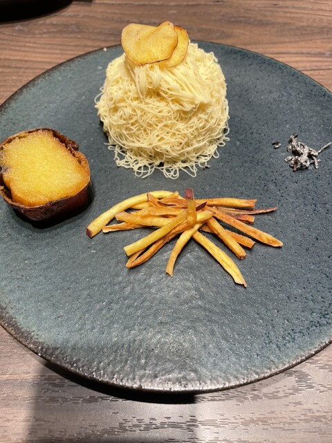プレートには、ねっとりとした焼き芋と、カリッとした食感の芋けんぴ(チップス)も添えられており、一皿でさつまいもの様々な表情を楽しめるのが嬉しいポイント。