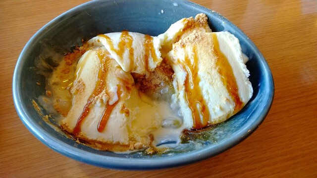 食後のデザートをお願いすると・・あまり期待してなかったデザート、黒蜜きなこのいも畑アイスのほうがインパクトがありました。こういった所でのデザートは、いつもの小さくて代わり映えの無いアイスなんだろうなぁと思ってたのですが、思ったよりは大きめのサイズ。早速、スプーンで割ると・・アレ?中に何か入ってる?・・一口食べてみると・・芋アンだ・・しかも温かい。これは仕様なのか?それとも冷ます前に提供してしまったのか?。多分、仕様だと思うのですが、危なかった。食べ始めるのゆっくりしてたら、アイスが解けちゃってたよ・・今でも少し解け気味だし・・。まぁ・・ただの黒蜜かけアイスと違って、温度差と味変の楽しみがあって美味しかったですけどね♪。