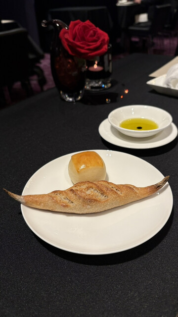 店内は 黒とラベンダーを基調 にした落ち着いたフレンチレストランらしい空間。全体的には落ち着いた大人な雰囲気で、ドレスコードもありドキドキ。