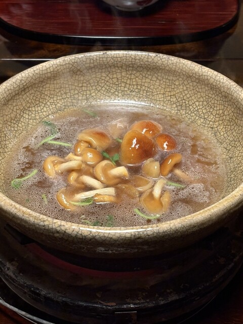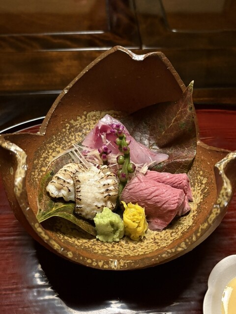 比良山荘の冬の名物として名高いのが、熊肉の鍋料理。地元・比良山で獲れた月の輪熊を使う希少な一品です。 画像でみたことはありましたが、実際に運ばれてきたら美しい色で綺麗な盛り付け、感動。