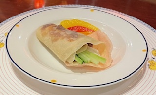 ・壷焼き北京ダックは、皮がパリッと香ばしく、甜麺醤の甘みとねぎの爽やかさ、きゅうりの清涼感が見事なバランス。