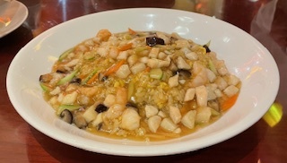 ・五目あんかけ炒飯は、イカや海老など海鮮の具材がふんだん。パラリと仕上がった炒飯に、コクのある餡がしっかり絡み、
