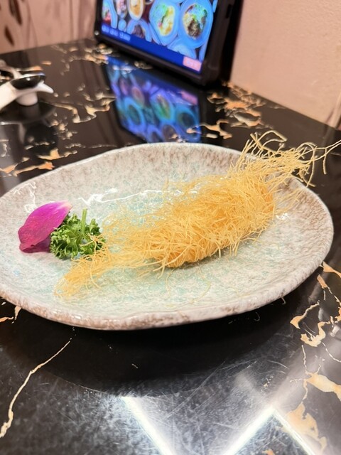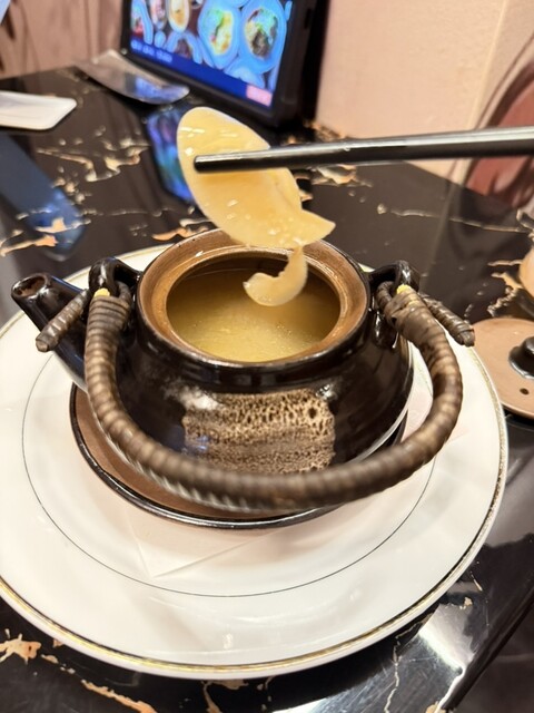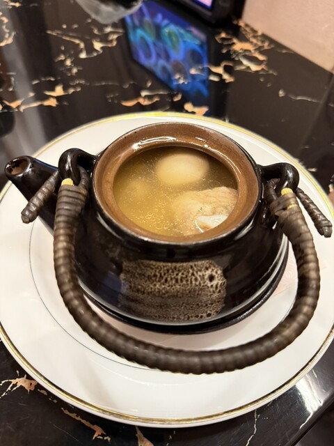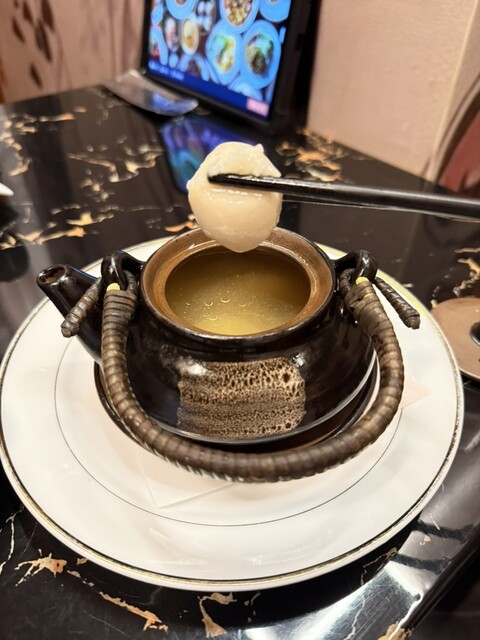 土瓶を開けた瞬間、湯気と香りで一気に心がほどける。スープは金色に輝き、体の芯まで温まる深い味わい。フカヒレはしっかり旨みが感じられて絶品。