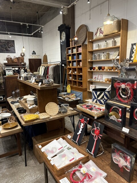 ガレージみたいな坂を下って行くと和食器が外に置いてあって、中にはカフェと雑貨が置いてある広い空間があります