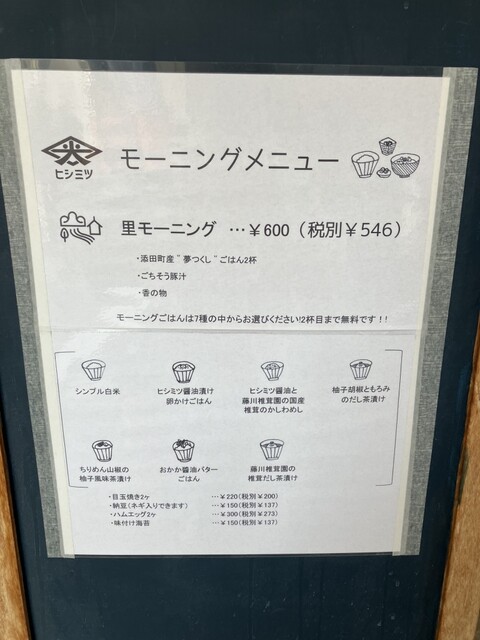 里モーニング(¥600)を注文。ご飯少なめで"卵かけご飯"と"椎茸のかしわめし"を選択。ご飯は素材の味が活かされていて、豚汁も甘みのある味噌&具沢山でとても美味しかったです!
