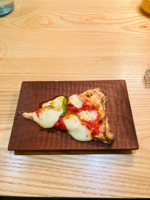 席についてコーススタート。1杯目のペアリングワインと併せて、まずは挨拶代わりのマルゲリータ。加水率高めの生地を手早く伸ばし、一般よりもかなり高温の薪窯で焼いていますね。