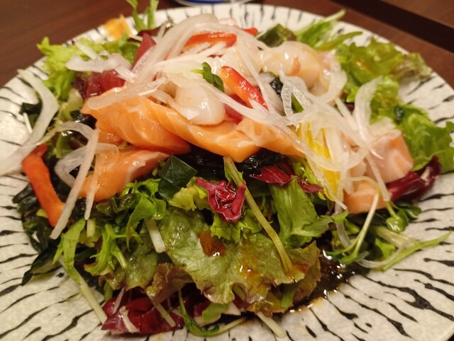 海の幸サラダは、サーモン、マグロ、ホタテ、イカと具材がとにかく豪華で、サラダとは思えない食べ応え。天ぷらの盛り合わせは想像の2倍ほどのボリュームで、揚げたてサクサク、最後まで満足感が続きます。