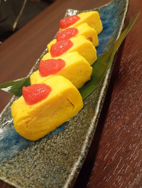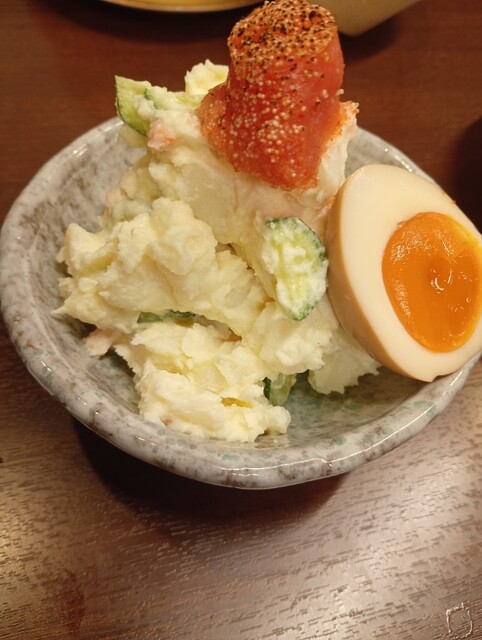 博多明太だし巻きは、ふわふわのだし巻き玉子だけでも十分美味しいのに、そこへ明太子が加わることで旨みが一気に加速。だしの優しさと明太子のピリッとしたコクが重なり、まさにダブルパンチの一品です。半熟卵のポテトサラダも明太子が乗っていて、なめらかなポテトに明太子のパンチが効いた満足感の高い味わいでした。