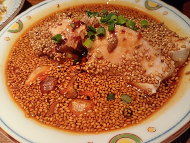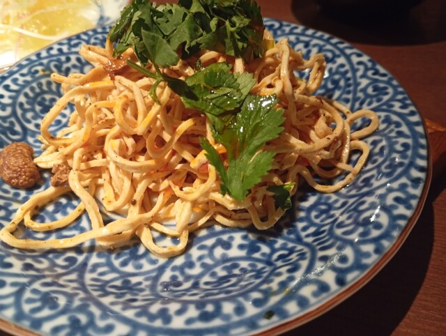 ピータンは未知の食感と味わいながら、クセはほとんど感じずとても食べやすい仕上がり。細切り豆腐とパクチーのラー油和えは、さっとつまめるおつまみとして優秀で、テーブルに欠かせない存在でした。よだれ鶏は辛さ控えめのラー油に、ごまとナッツの香ばしさが加わり、食べ進めやすい一品です(・∀・)
