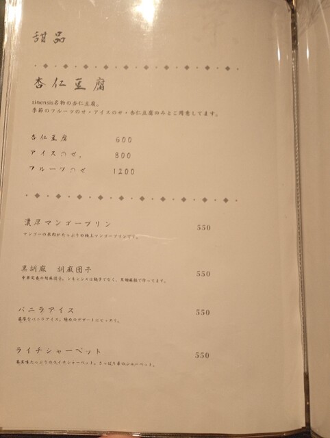 デザートの杏仁豆腐は、硬めでプリンのような弾力。控えめな甘さが上品で、カラメルソースとの相性も抜群でした。創作性と完成度の高さを存分に楽しめる、記憶に残る中華料理店です。