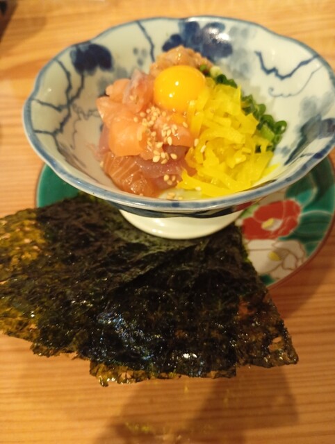お造りの鮮度も抜群ですね。サーモンは独特の甘みが強く、マグロの赤身は驚くほどジューシー。イカは口の中でとろけるような甘さで、お箸が止まりませんでした♪ そして、ぜひ頼んでほしいのが「海鮮爆弾」です。たくあんの食感と納豆、そして贅沢な海鮮を混ぜ合わせ、韓国のりに包んでいただくのですが、これがお酒にも合いますし、何より食べるのが楽しい一品です^^