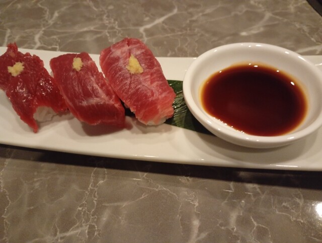 〆の「3種馬刺し握り」も絶品です。お米と特製ソースが馬肉のポテンシャルを最大限に引き出しており、お腹いっぱいのはずなのにペロリと食べてしまいました。最後はバニラと抹茶のアイスでさっぱりと。