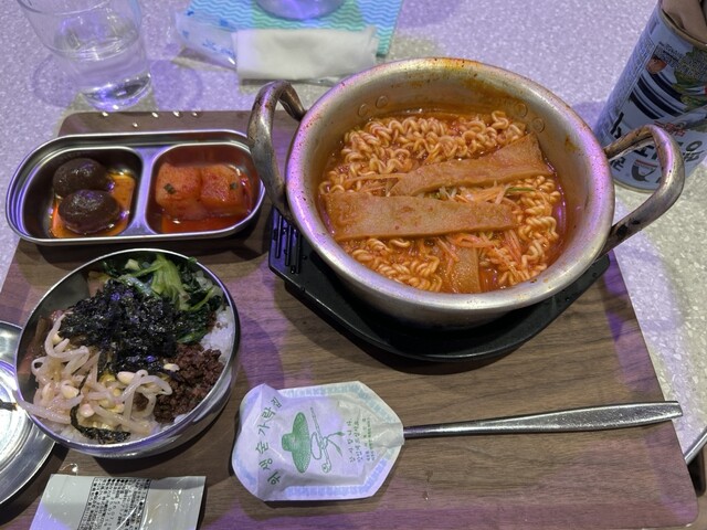 お鍋もビビンバも予想より小ぶりだ、うんうまい、辛ラーメンとは麺が違う、辛くはないが、濃い味