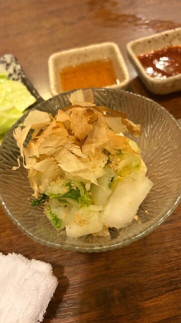 久しぶり顔を出してみました。店長夫妻の笑顔と店員さんの呼び出ボタンに反応した『あいよ〜』の元気な溢れるお店です。お通しは『生キャベツ』に酢と特製ダレが出てきます。今日は『シャキシャキ白菜』と『とり天』を注文しました。とり天はサク・フワッとの食感か堪りません。