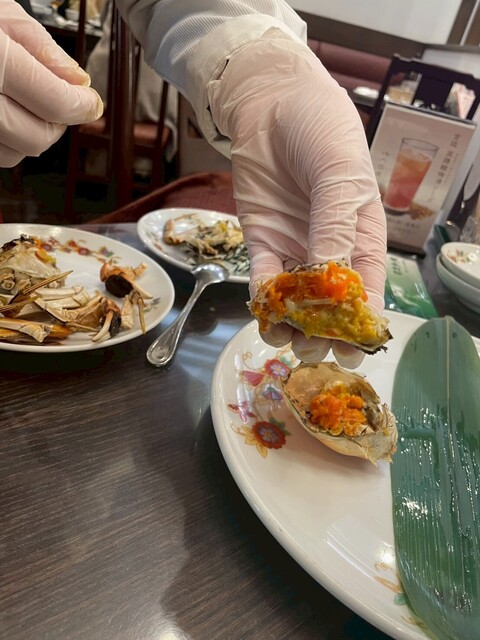 メスの上海蟹を丁寧に捌いてもらい、台湾紹興酒の常温によく合いました。