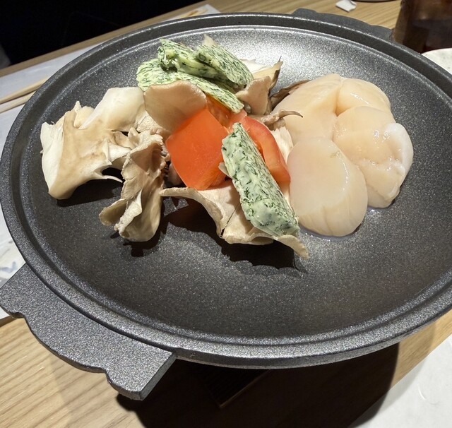 ホタテと舞茸の香草バター焼きはテーブルで仕上げる演出付き。