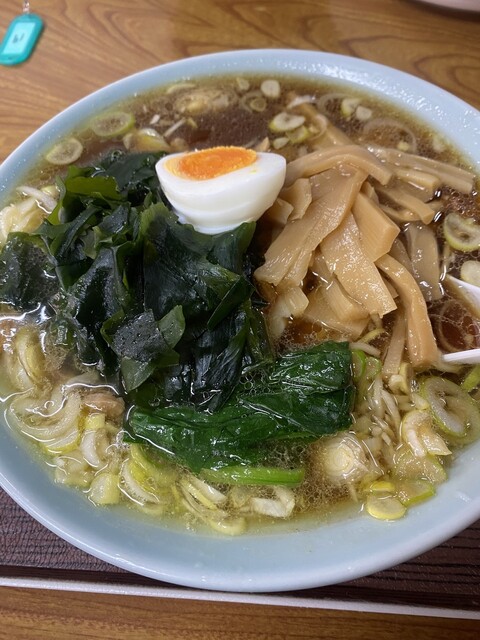 ラーメンの具材はほうれん草、白ネギ、ナルト、ゆで卵半身、メンマ、ワカメ、親鳥チャーシュー。