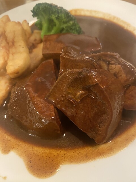 肉厚でトロッと仕上げられていて実に美味い。濃厚ソースとのバランスが良い。付け合わせのポテト、ブロッコリー、隙がない。満足度が高い一皿。必食。