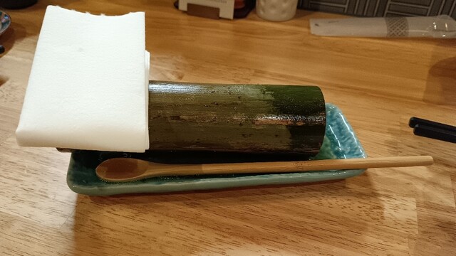 通常の焼き鳥コース2500円に大将おすすめの青竹を使った鶏肉の郷土料理、かっぽ鳥を付けてもらいました。