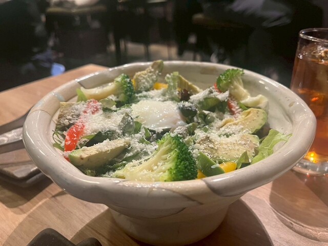 ブロッコリーやパプリカなど野菜もたっぷりで、温玉と粉チーズ載ってます。