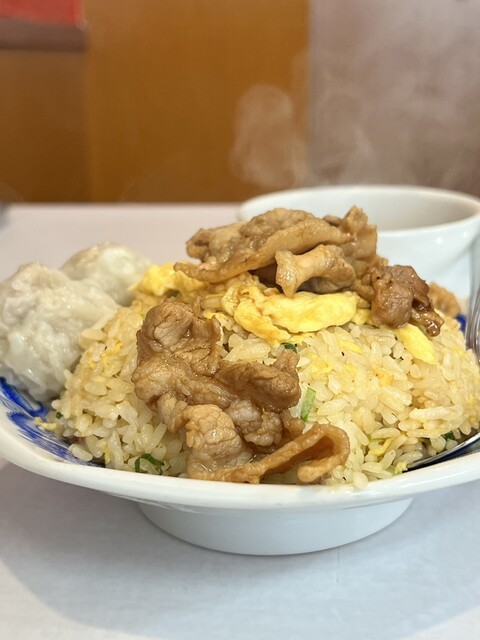 パラパラのチャーハンの上に大きな卵と豚肉炒め、シューマイが2つ乗っていて、ボリューム満点かつビジュアルから食欲をそそられる逸品です。
