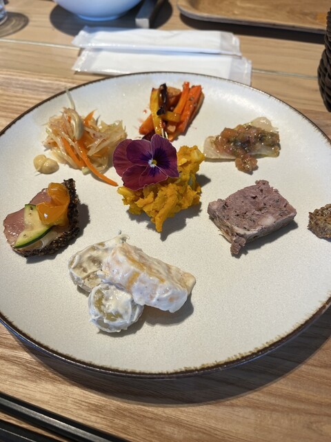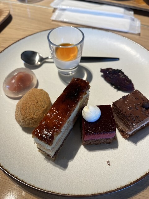 コートヤードバイマリオットの2階にあるレストランです。入店すると大きなガラス窓から光が差し込んで、明るい開放感のある空間になっています。ソファー席のデザインも清潔感が感じられて、とても気持ちよく食事をすることができました。冷たい前菜の品数が多く、すべて衝撃の美味しさでした!!!お肉系の種類は多くはないので、ガッツリ肉を食べたいっていう人にはもしかしたら物足りなさを感じてしまうかもしれません。ですがそれもデザートの種類の多さでカバーできると思います。ビュッフェのデザートでよくある一口サイズの四角いケーキあるじゃないですか、ほとんどスポンジなので個人的には好きではないのですが、どんなもんかと食べてみました。なんと一口ケーキのクオリティもピカイチです。