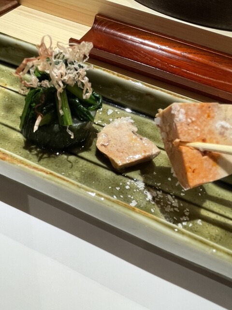 落ち着いたカウンター席に案内されると、職人の丁寧な所作が視界に入り、食べる前から期待が高まる。コースは先付から始まり、
