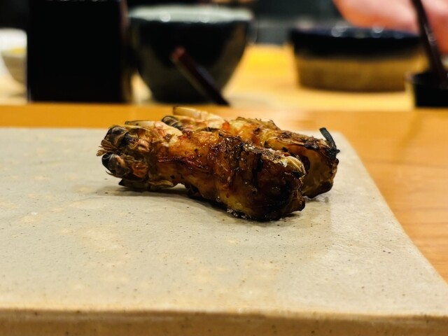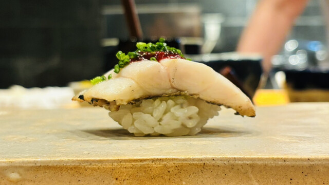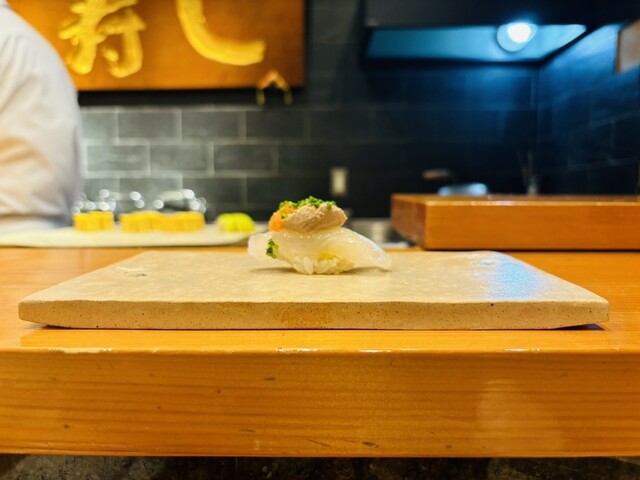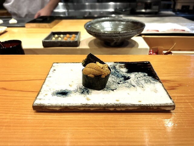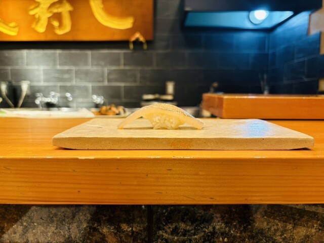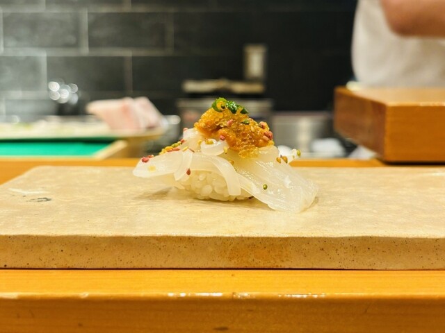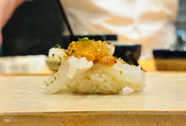 細工の入った烏賊の上に雲丹と飛子をあしらい、さらにかぼすを絞り七色の胡麻をまぶすという一貫が名物となっており、視覚・味覚・香りが一体となった仕立てでした。