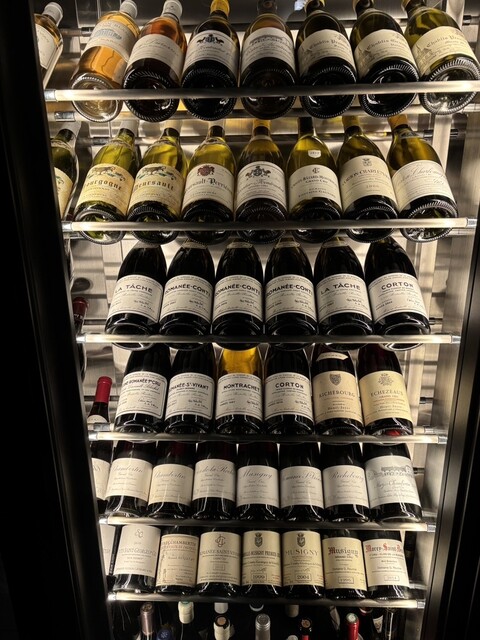 中に入るとキャッシャーがありお出迎えをしてくれ案内される。目に付くのはワインセラーの豪華なラインナップ。感激。