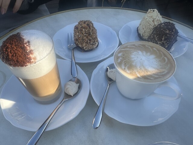 ショコラ、ホワイトチョコ、ヘーゼルナッツのケーキとキャラメルマキアート、カフェラテホットを注文。