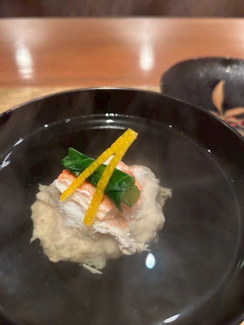 大きい柚子の中に蟹真薯、餡掛けの一皿は特に美味しかったです。