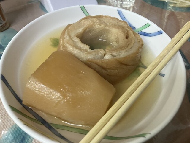ドーミーイン野乃から5時30分に予約した、かぶ菜さんへ向かう途中で5時に訪問、3回転目を予約するもカニ面無くなったらゴメンねー。との事。かぶ菜さんを腹八分目で終了し、お店を出ると菊一さんから電話が!(回転か早いと電話をしてくれます)グッドタイミング、さー次はおでんだー。着席後、まずはカニ面ををオーダー!良かったーまだ有ったー。車麩、銀杏、バイ貝、出汁巻き、etc、ん〰️満足度!