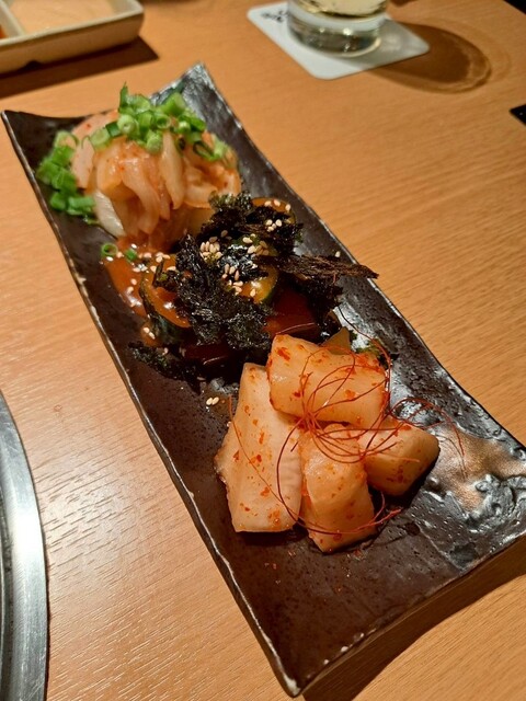 前菜のキムチ盛り合わせは、辛さ控えめで旨みがしっかり。
