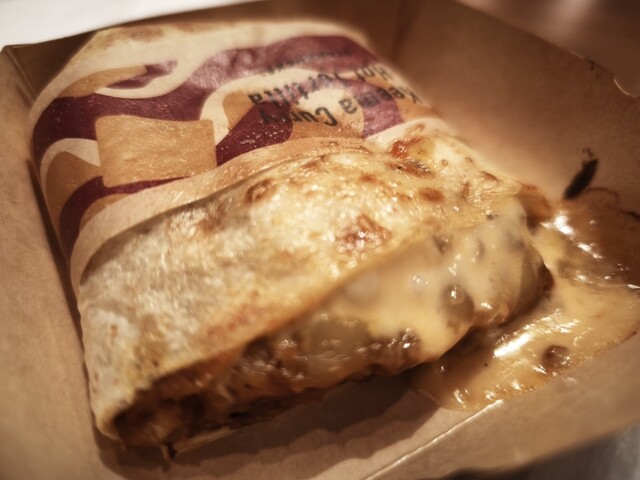 ヒーティングされたトルティーヤは、手に持つと指先が熱くなるほどのアツアツ状態。一口かじると、モチッとした生地の中から、芳醇なスパイスの香りと共にキーマカレーが溢れ出します。そこにとろりと溶けたチーズが絡み合い、コクと辛味のバランスが絶妙。辛さは控えめでマイルドなため、子供でも安心して頬張れる優しさがあります。寒い朝の空腹に、この熱量が染み渡るのがたまりません。