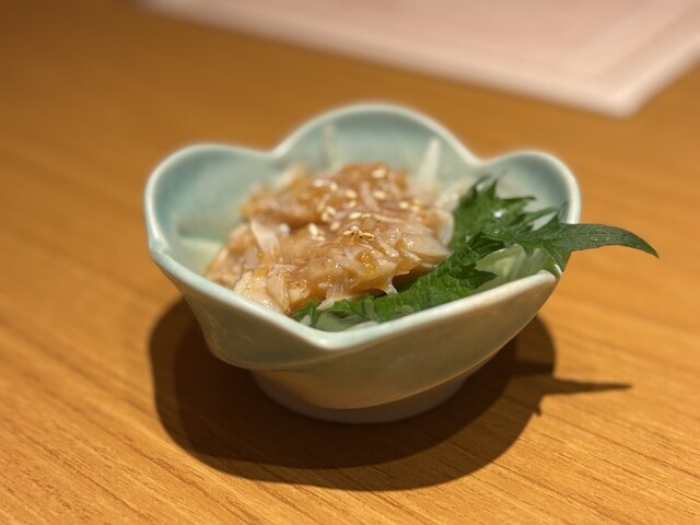 このオーダーを見た瞬間に分かる。今日は本気の“飲み”だ。キムチ、梅水晶、たこわさ、いか明太、酢モツ、鶏皮ポン酢、白子ポン酢。名前を並べただけで酒飲みはうなずくはずだ。これだけで日本酒が進まないわけがな...