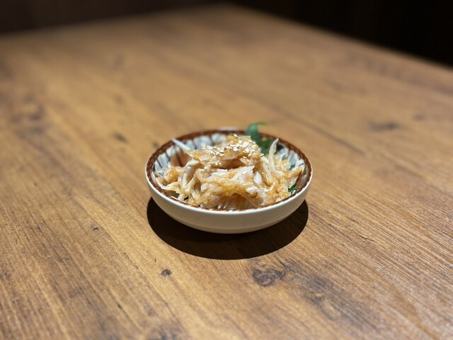 続いてキムチ、梅水晶、たこわさ、いか明太、酢モツ、鶏皮ポン酢、白子ポン酢と、酒飲みにはたまらない小皿がずらり。どれも塩味や酸味が程よく、日本酒を誘う味わい。特に梅水晶のコリコリ食感と酸味は秀逸で、つい箸が止まりません。
